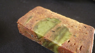 Si ultimul, un sapun cu sare de mare si alge, fara parfum. A iesit foarte frumos insa cred ca am exagerat putin cu sarea si din cauza asta e destul de fragil, se rupe usor si cred ca il voi reface. Dar pana una alta il voi prezenta pentru ca totusi arata bine si ca si celelalte sapunuri contine numai uleiuri vegetale bune pentru piele. Mai exact are uleiuri saponificate de cocos, masline in procent de 65% (mai mult ca la celelalte), palmier, alge maruntite, sare de mare si albatru de metilen.